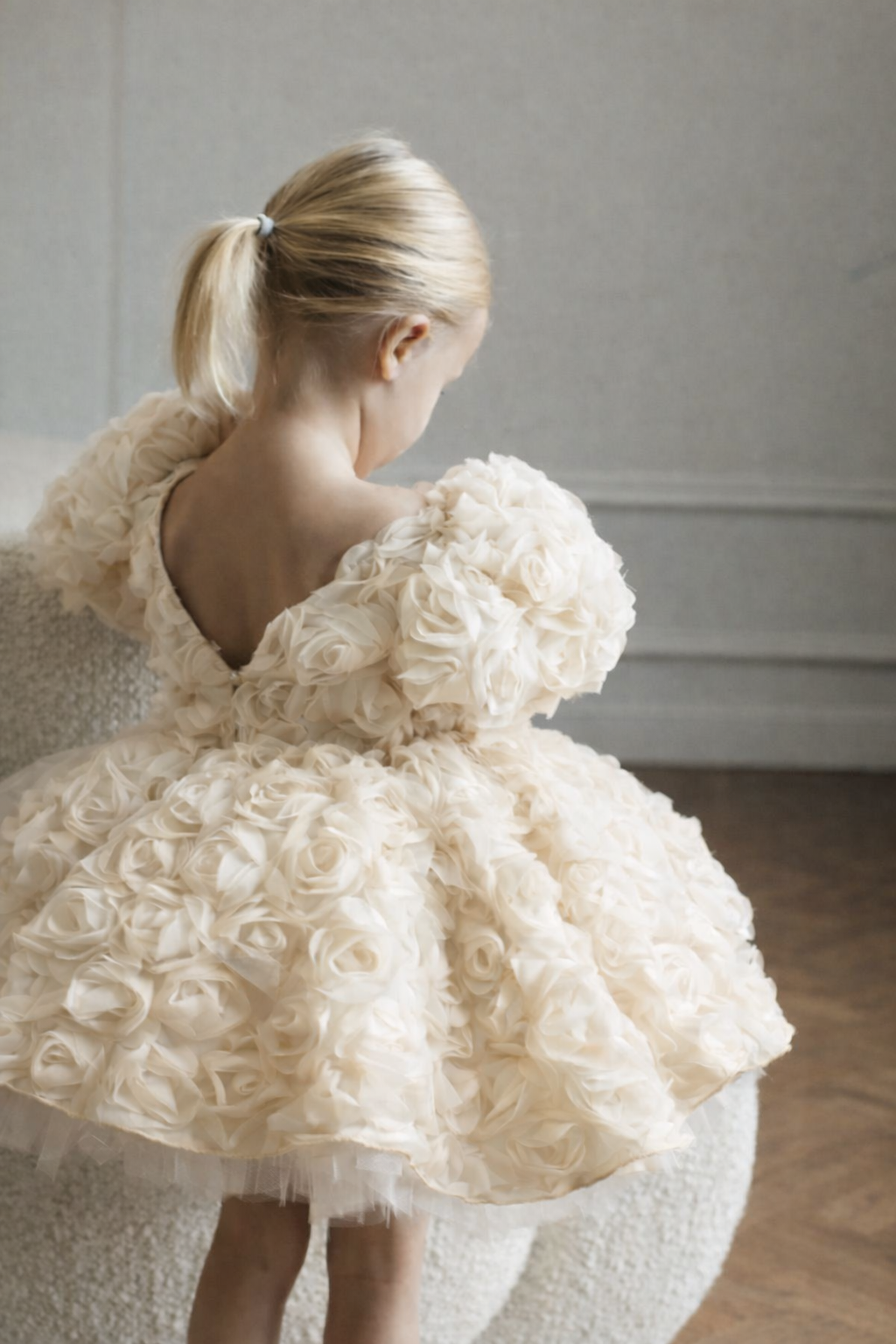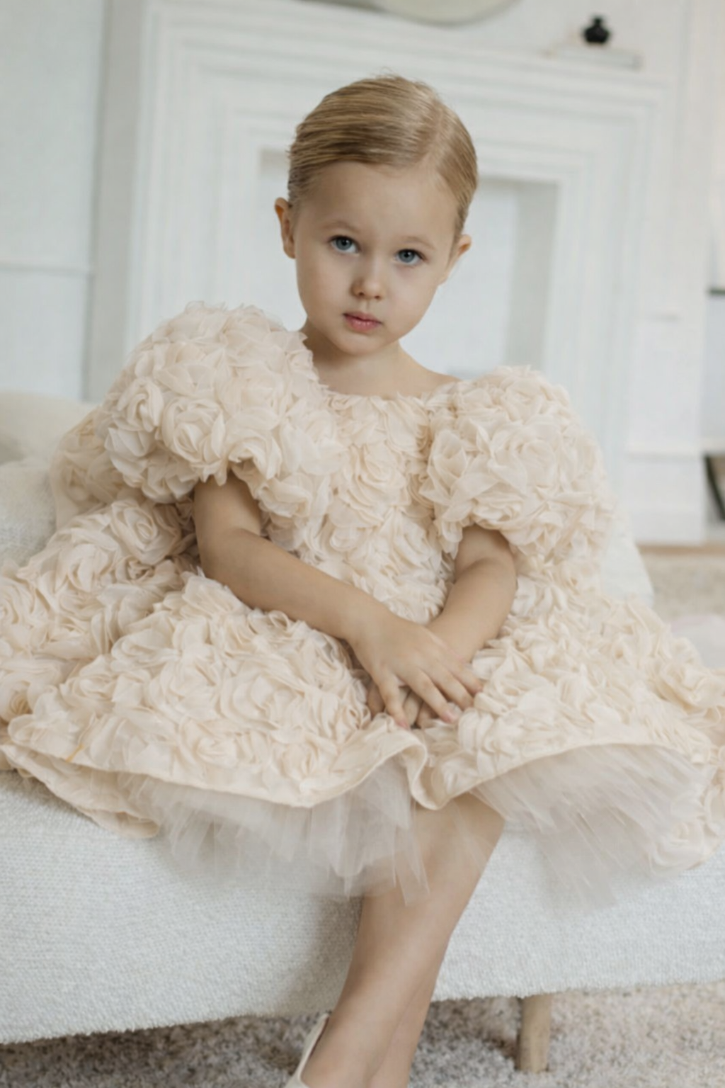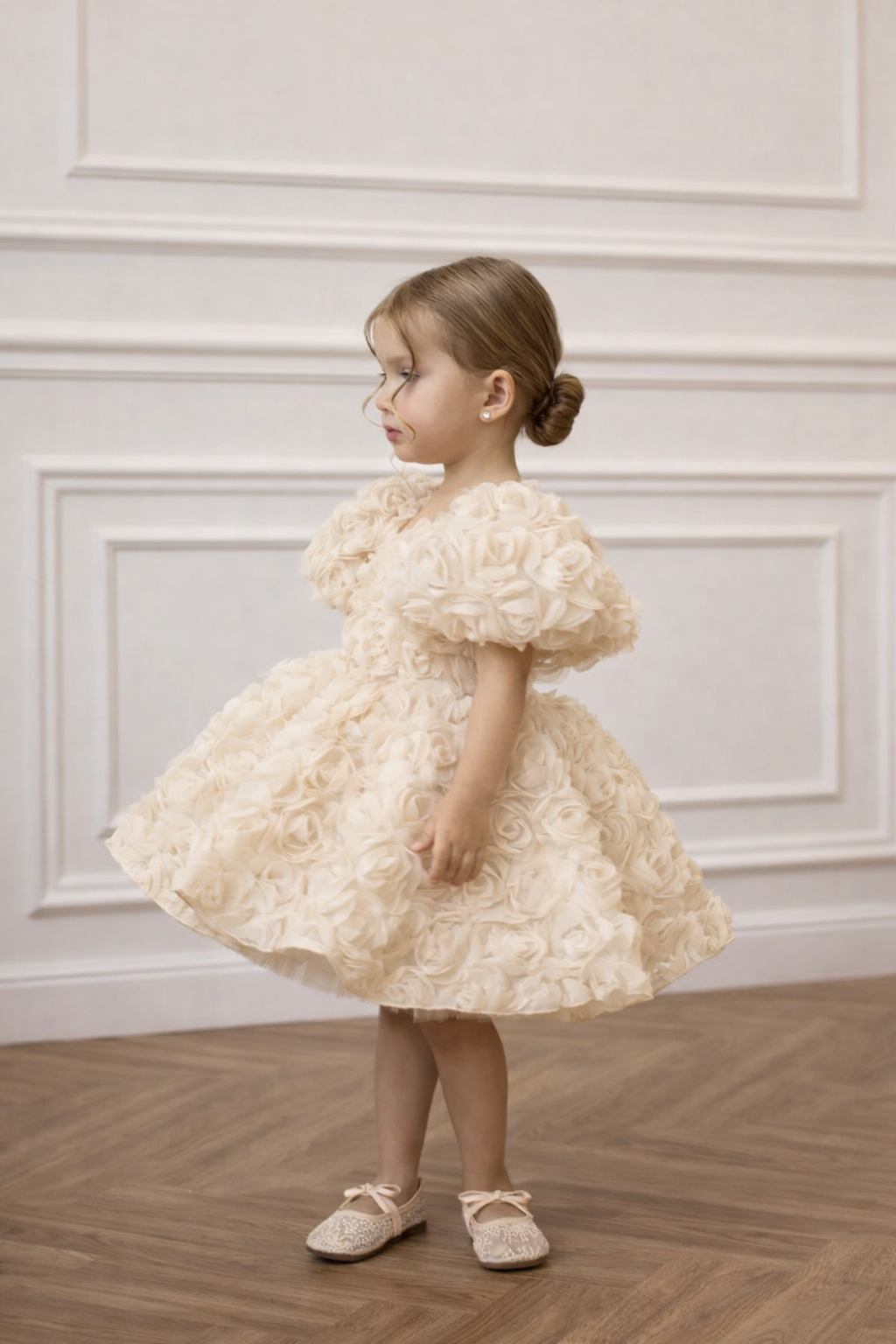 Manolya Krem Gül YuvarlakYaka Sırtı V Kız Çocuk Elbise